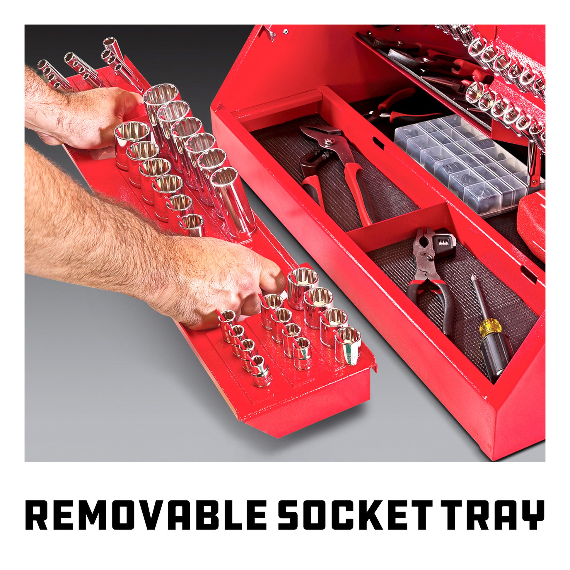 This portable 26-inch slant tool box will stand up to harsh life both on the road and in the shop. With details like fully-welded seams, premium powder-coating, chrome-plated hardware, a heavy-duty lock and a weather-sealed lid, you can confidentially leave your tools in the box without worrying about rust or casual theft. With a 250 pound weight capacity and storage for up to 94 sockets, 50 combination wrenches, 9 screwdrivers, 19 ratchets or extensions, extra open storage space for gloves, fluids and other gear, the box also includes a removable socket tray to offer even more versatility and flexibility on the job.